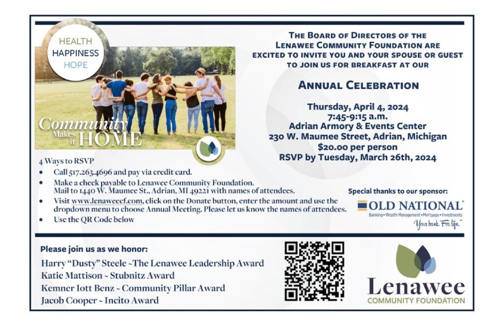The Lenawee Community Foundation is seeking nominations for three awards that will be presented at our Annual Meeting on Thursday, April 4th, 2024. These three awards are The Lenawee Leadership Award, the Stubnitz Award, and the Incito Award. The Lenawee Leadership Award honors individuals or couples, who exemplify the underlying principle that the future of […]